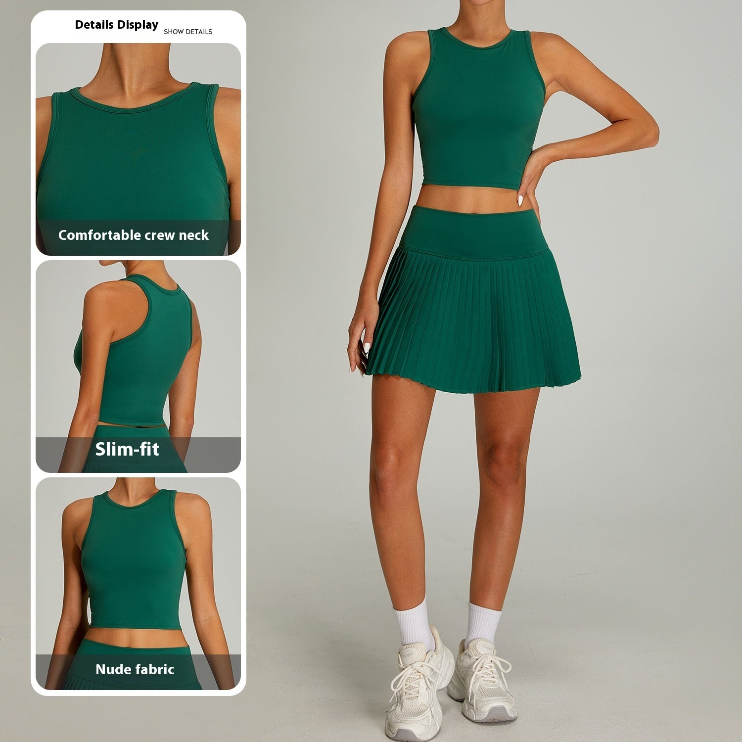 Serve looks on and off the court with this Nude Feel Tennis Skirt Set. Designed for movement and elegance, this 2-piece set includes a breathable sleeveless crop top and a high-waisted skirt with built-in shorts for confident performance. Made from sweat-wicking, lightweight fabric, it offers a sculpted fit without restricting your swing. Ideal for tennis, pickleball, or a sporty brunch look – it's the perfect blend of comfort, femininity, and power.