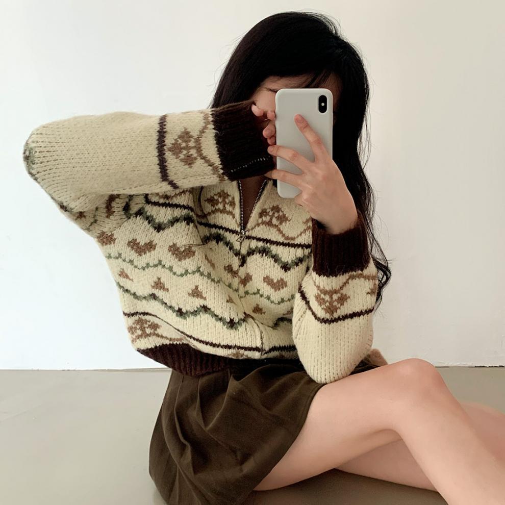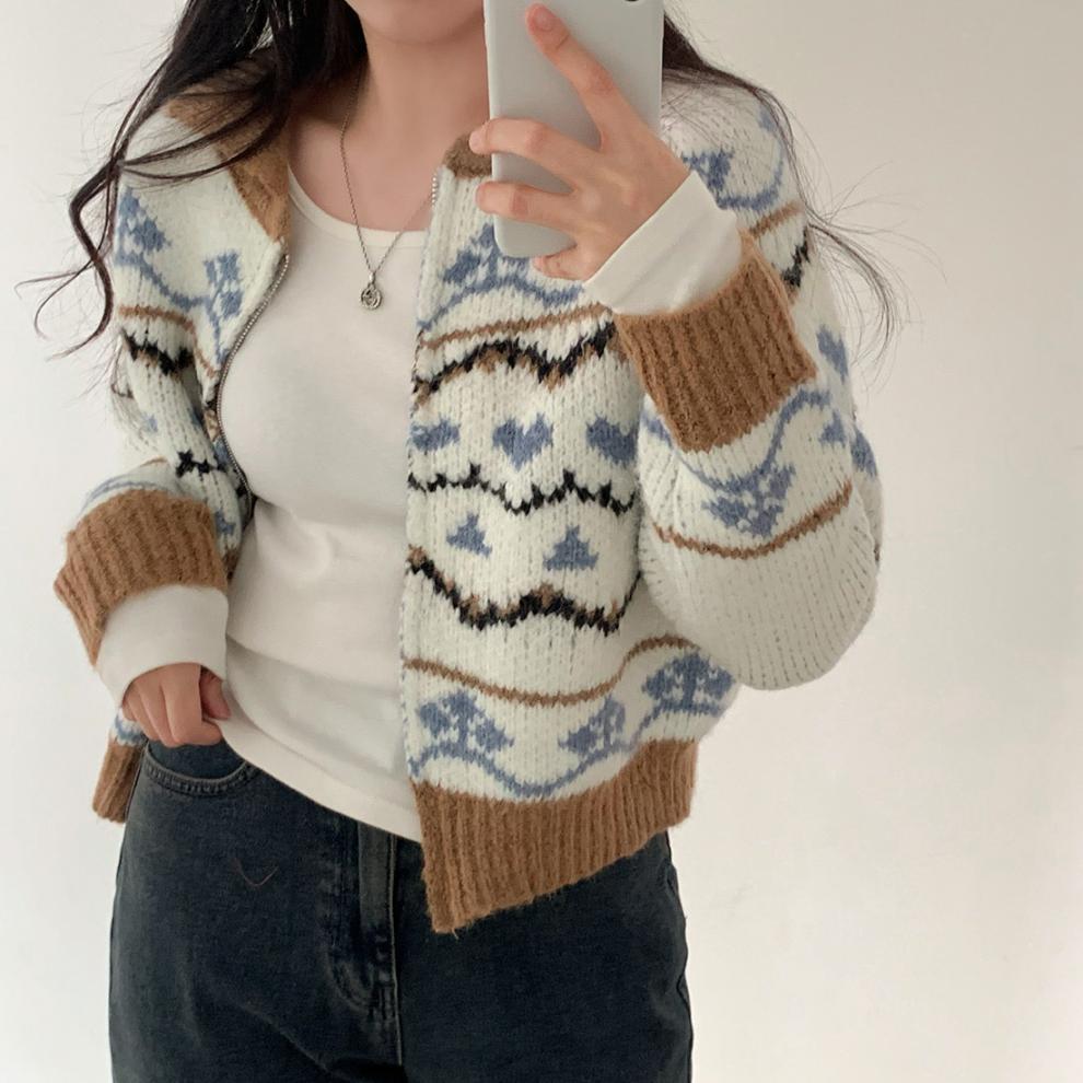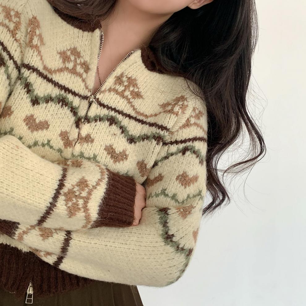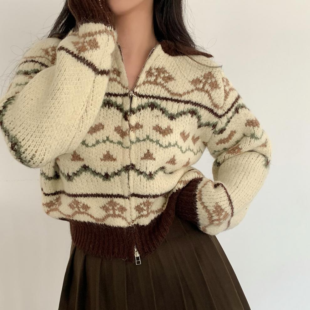 The Vintage Weave Zip Cardigan blends cozy warmth with timeless retro charm. Designed with a classic jacquard knit pattern, this cardigan adds texture and personality to your everyday style.